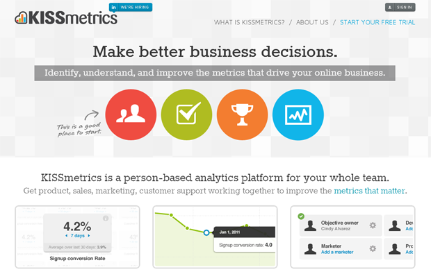 Đây là một công vụ phâ tích cho phép theo dõi sự kiện trên thiết kế website của bạn. Điểm khác biệt của Kissmetrics là gom toàn bộ các data tracking lại một chỗ. Giúp bạn có thể gộp các dữ liệu sessings, page view hoặc journey theo người.